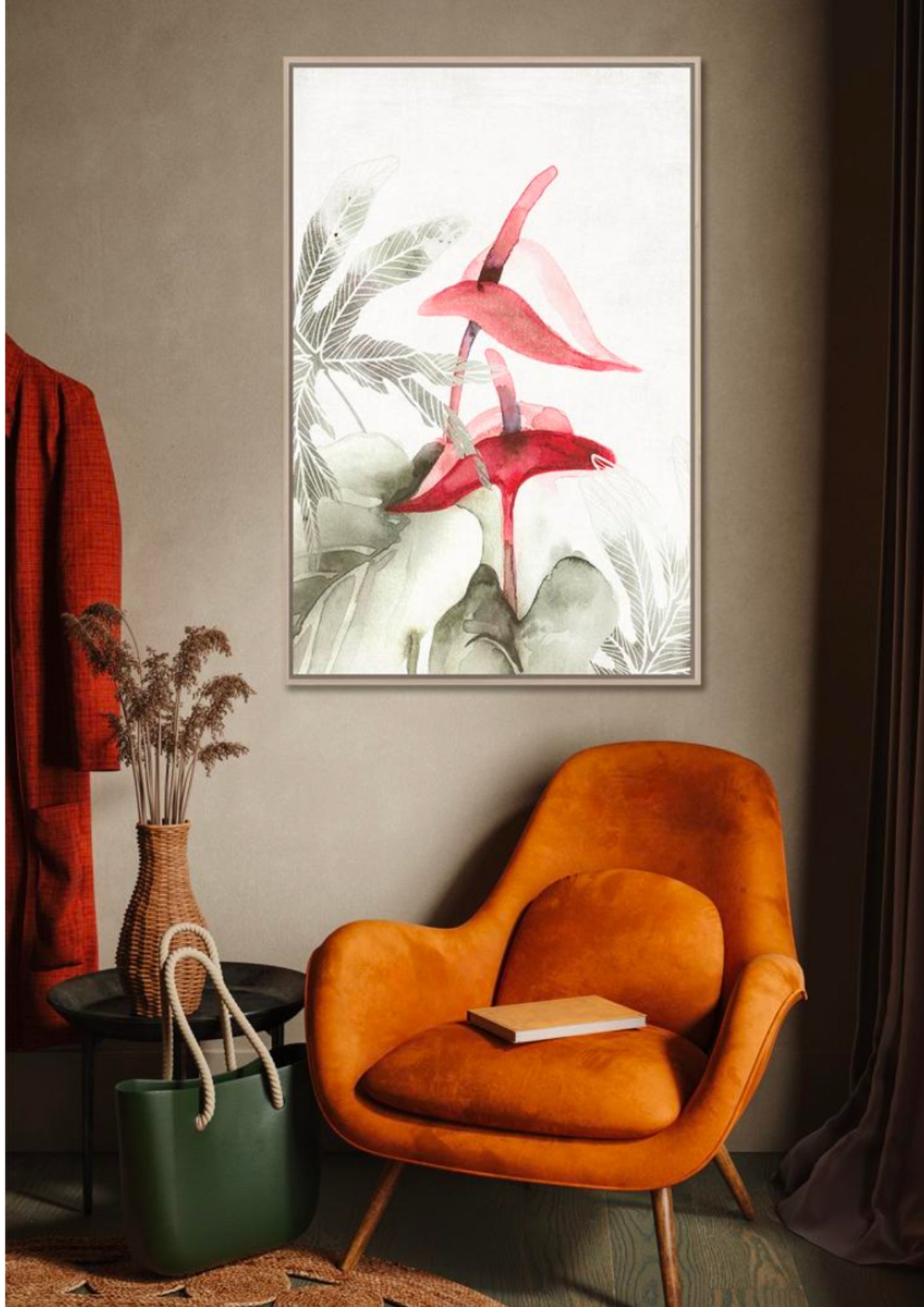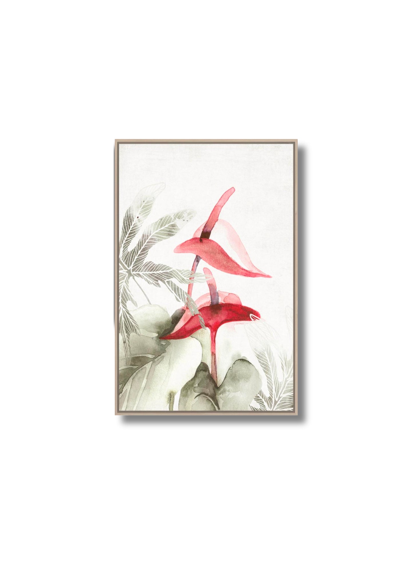 Bring tropical elegance indoors with this framed watercolor print, featuring vibrant anthuriums and soft palm fronds in a delicately balanced composition. The vivid reds and pinks bloom against a near-white canvas, creating a serene yet striking focal point. Ideal for modern or coastal interiors, this artwork blends botanical beauty with refined minimalism—offering a sophisticated accent that evokes warmth, nature, and timeless style in any living space.