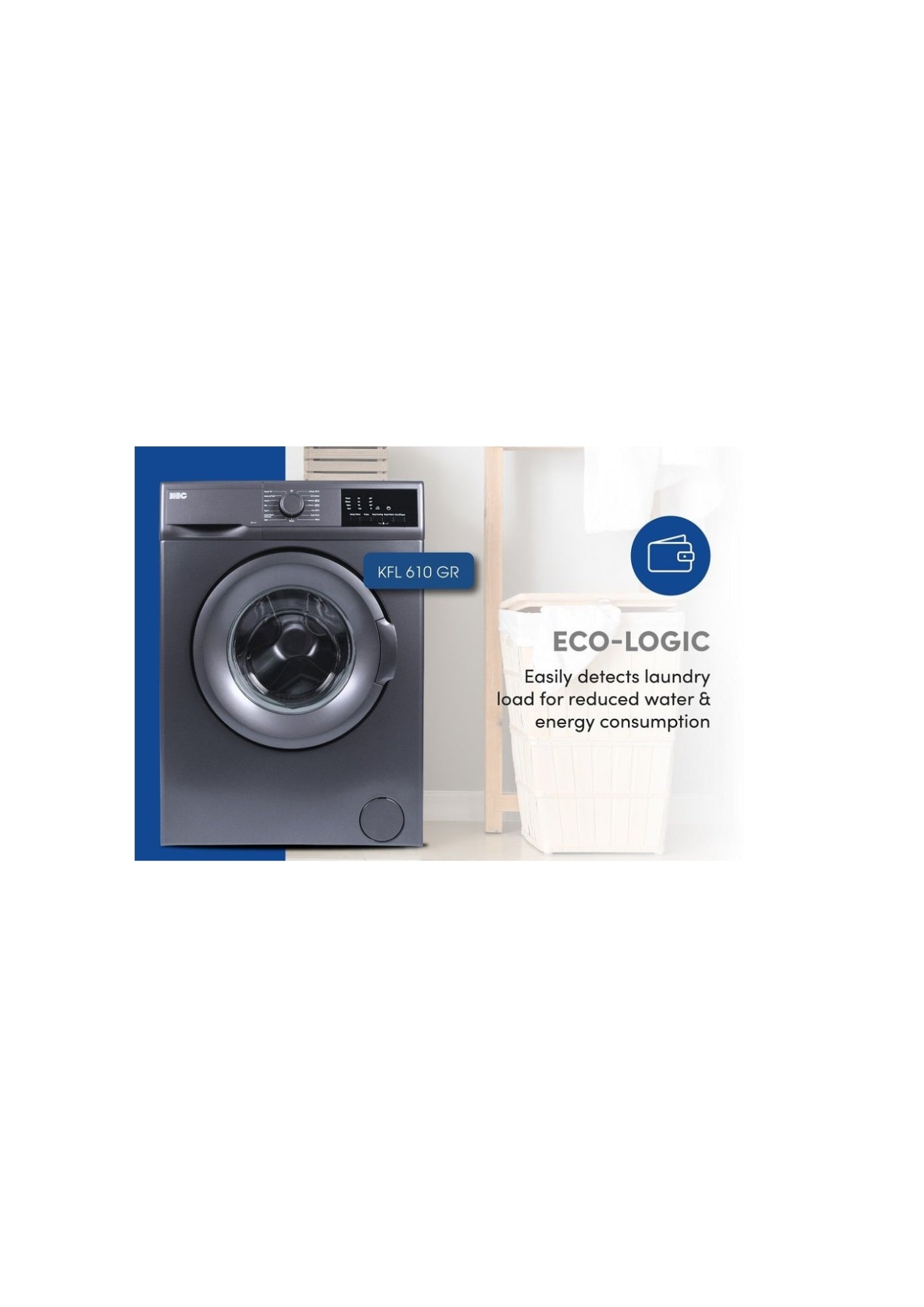 Smart and efficient, the KIC KFL610 GR delivers 6kg capacity with A+++ energy performance. Eco-Logic technology adjusts water and time to suit each load, while rapid and sport wash cycles tackle everything from quick refreshes to heavy-duty laundry. With easy ironing, load balancing, and cold wash options, this front-loader offers everyday care in a compact design—perfect for modern homes seeking reliable, resource-conscious cleaning.